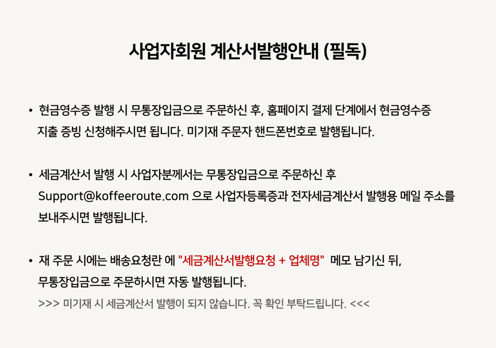 • 세금계산서 발행을 원하시는 사업자분께서는 무통장입금으로 주문하신 후 support@koffeeroute.com 으로 사업자등록증과 전자세금계산서 발행용 메일 주소를 보내주시면 발행됩니다.